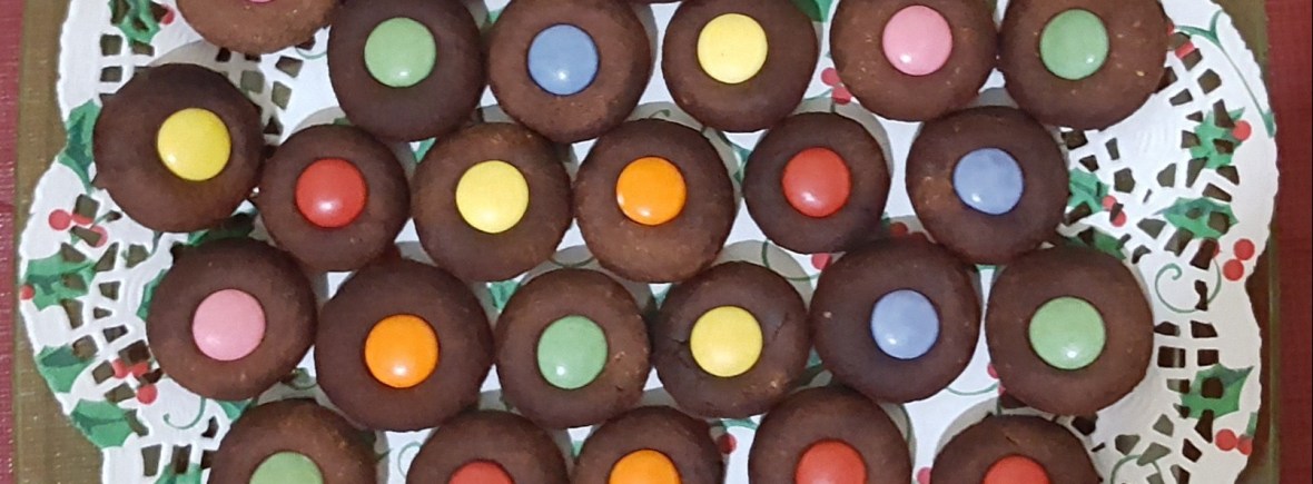 - Place one smartie in the centre and press down a little gently so that the smarties sticks in the dough but not too much as the dough will crack;
