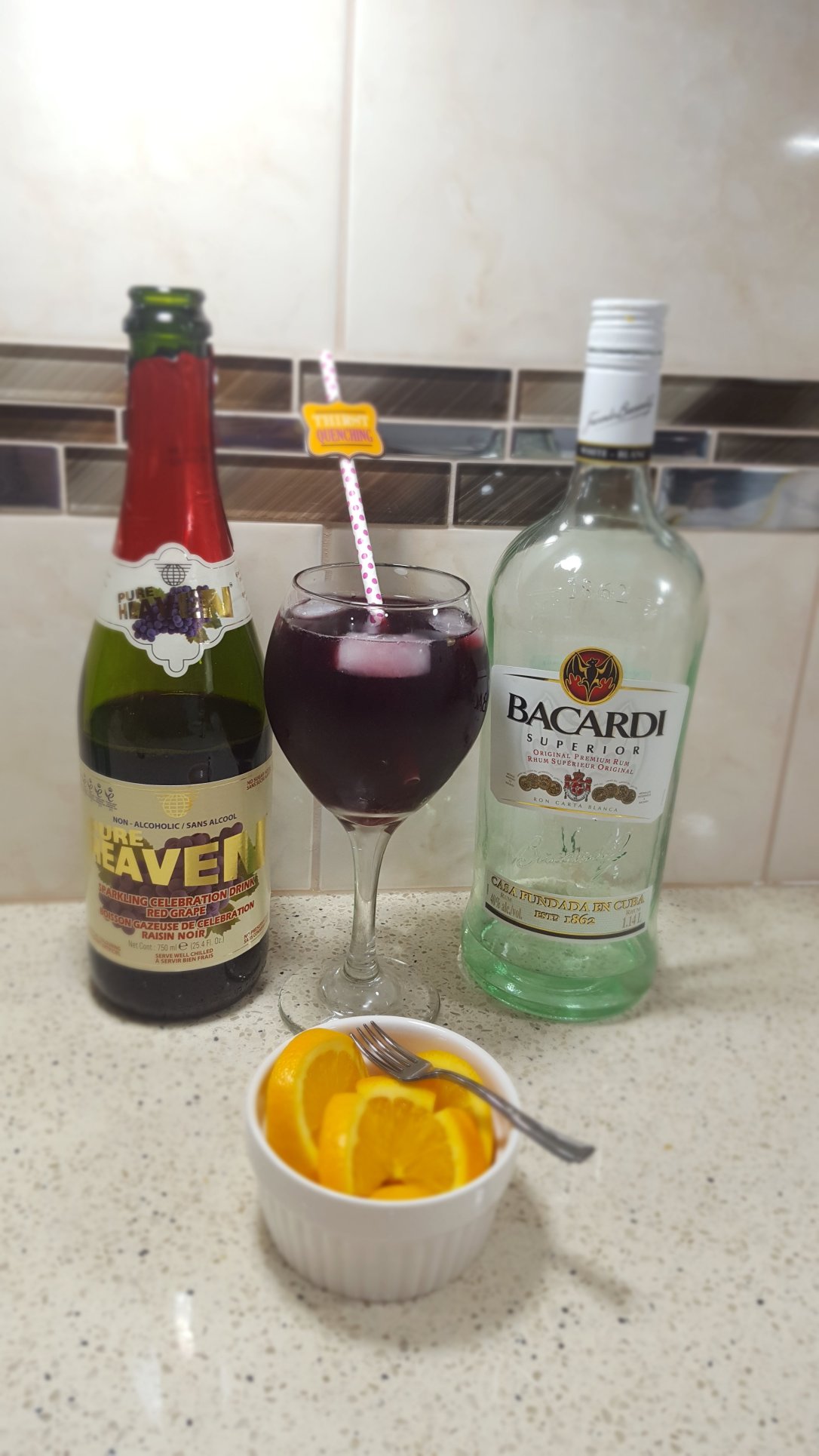 Its a very simple drink made from four items easily available at home and at stores. To begin with, we used seedless orange as it will give a sweet tangy flavor and maple syrup to add a sweet, fresh, scent of concentrated sap. The addition of Bacardi and sparking red grape juice into that mix resulted into a heavenly drink of light crispy, tangy and sweet flavour.