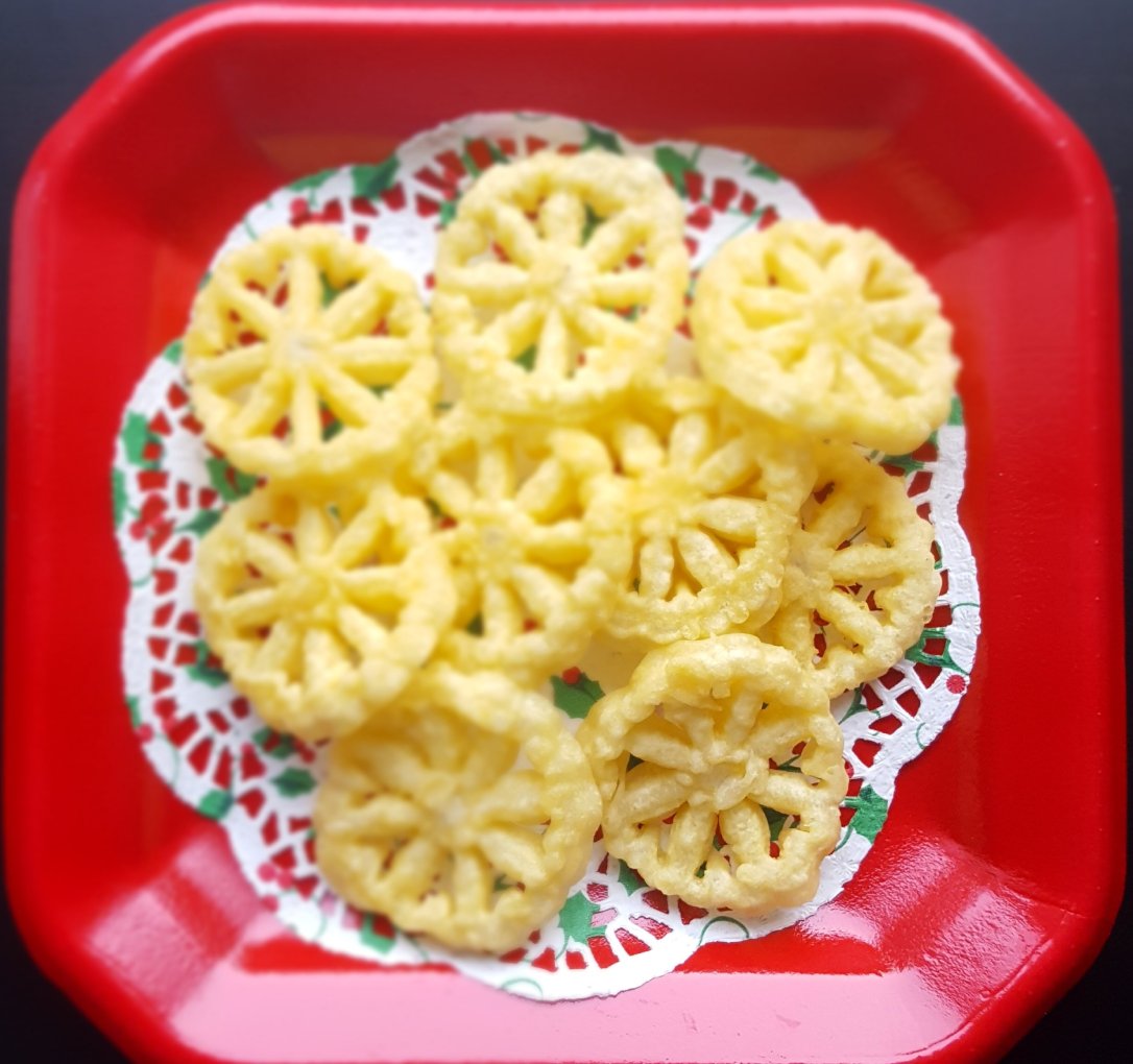 Rose cookies are very delicate in taste as well as to touch. It was an enigma to me until recently when I gave it a try a third time. My cookie batter till then stubbornly refused to transfer successfully into the oil and always slipped back into the batter. I was at my wit’s end and ready to give up. However, my spouse gently nudged me this time to give it a final try. They say thrice does a trick and it was so true. Well, here it is successful and so delicious – yummy!!. It remained fresh even after three weeks.