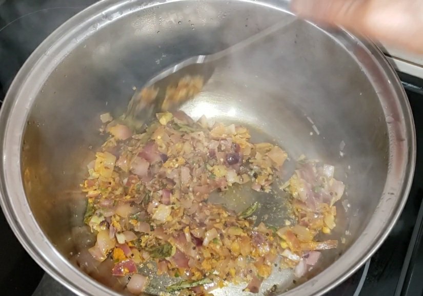 Add mustard seeds and let it splutter. Next add cumin seeds and immediately add onions so that the cumin seeds don’t get burnt