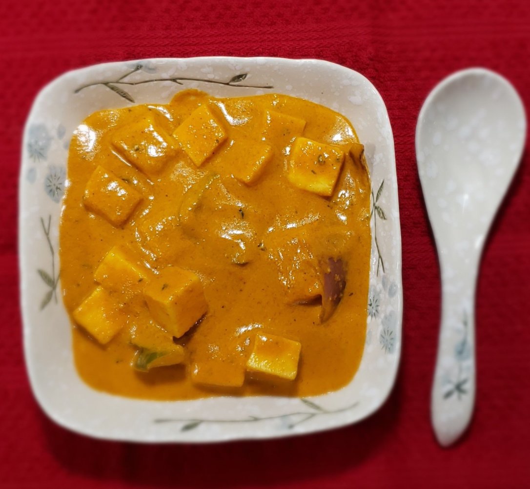 - Once it heats add paneer, sweet pepper and salt (if required). Allow it to boil till paneer and pepper softens. Stir and remove from stove
