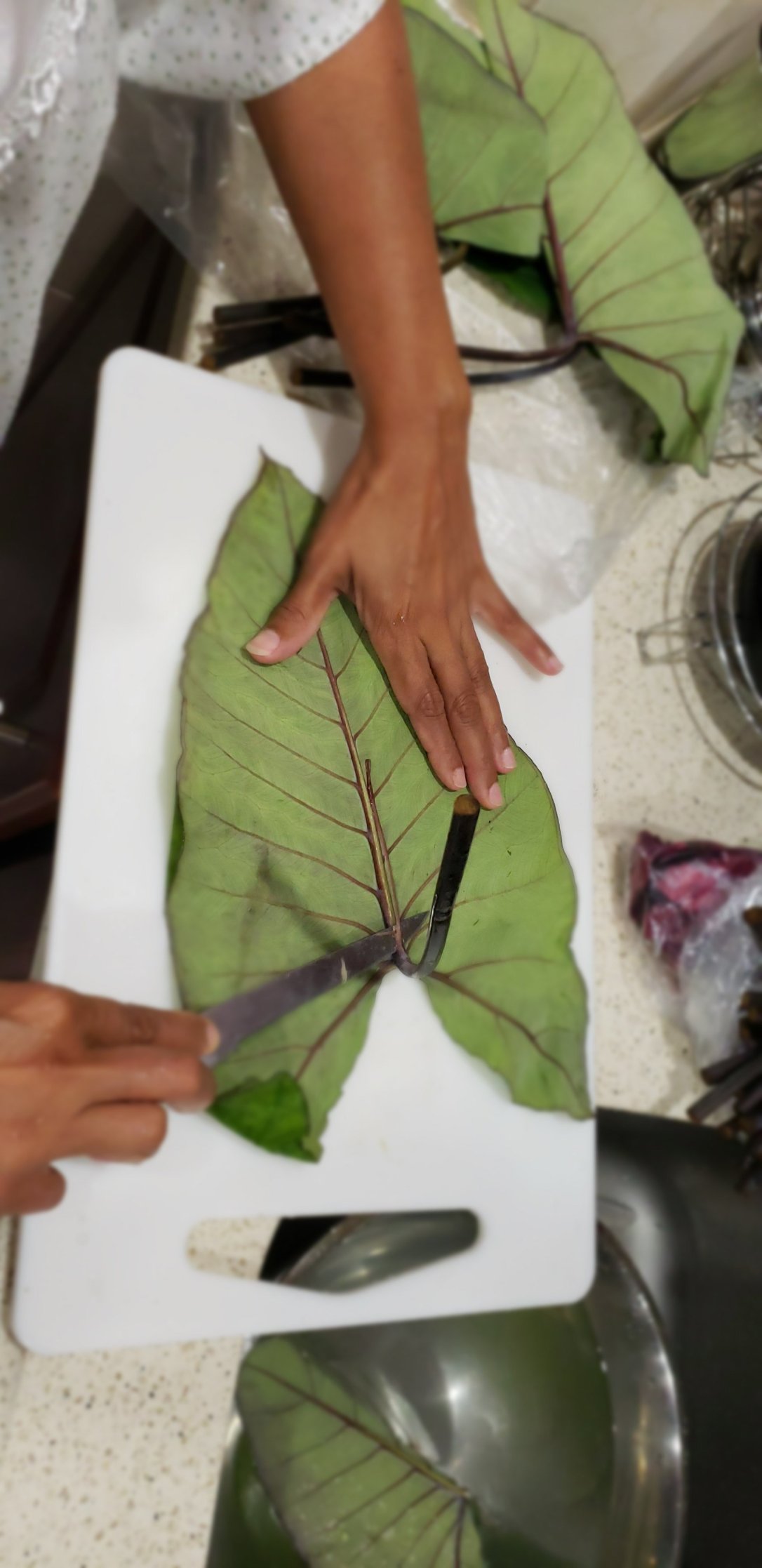 - Lay down big leaves – 2 overlapping each other – pour the batter in the middle and fold the leaves. Immediately put in the steamer and steam it till a toothpick comes out clean.